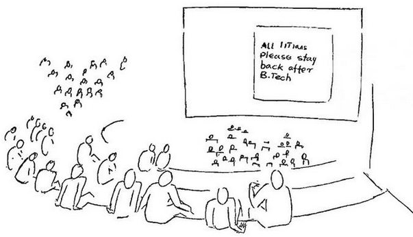 Editor’s Note: During intermissions, announcement slides would appear on the Open Air Theatre screen. The cartoon below was inspired by messages such as “All team captains stay back after the movie to meet the Sports Secretary.” It also lightly nods to a well?known trend from that era, when many B.Tech. graduates chose to pursue opportunities in the US soon after completing their studies.